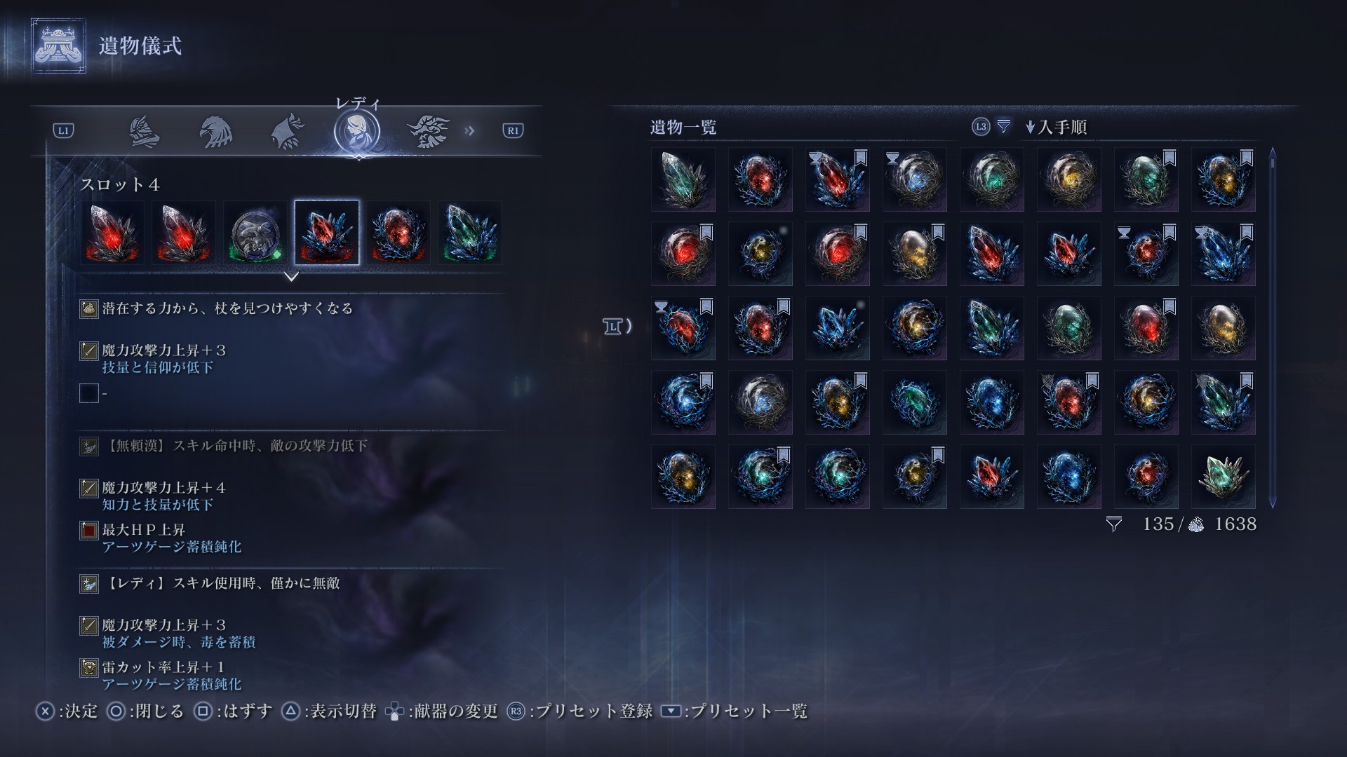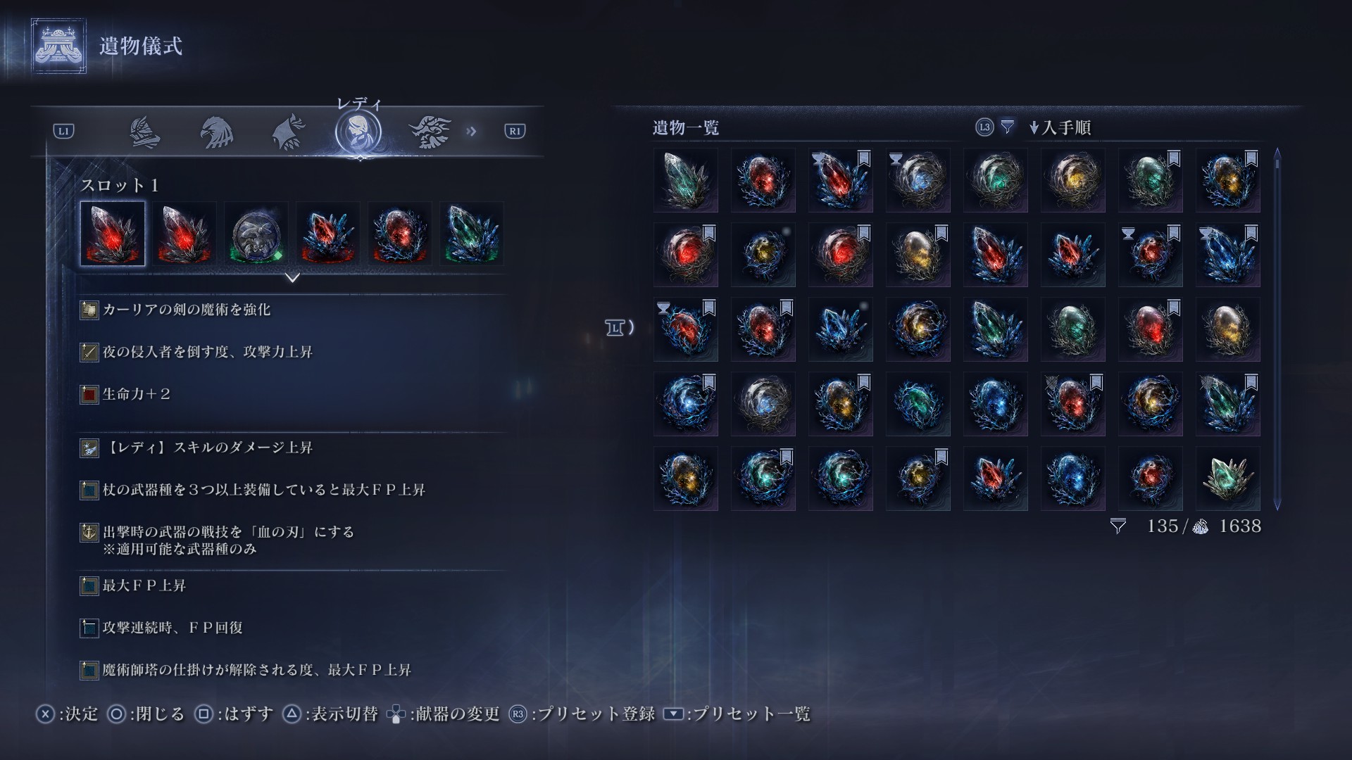 野良だと魔術師塔に寄るのが遅くなったり、最悪杖を譲ってもらえないパターンもあるので特化構成はおすすめしません。逆にフルパなら開幕から杖を探すムーブができるので、特化構成もありだとは思います。とは言え結晶特化構成にするなら正直隠者でいいと思うので、レディは特化にするならカーリア特化がおすすめ。あるいは低燃費の重力に寄せるのもありだと思います。