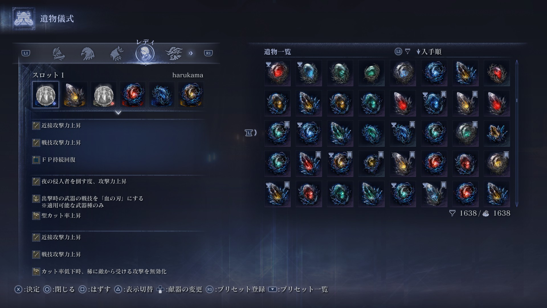 DLC前は封牢バフが強かったですが、大空洞の可能性を考えて非採用にしています。侵入者バフは深度が上がれば上がるほど付けているプレイヤーが多くなるので、深度4以上なら必須だと思います。深度4以降は最大HPを上げたりするよりも、火力を上げて戦闘時間を短くする方がファームやボス戦での事故が減るので火力に寄せるようにします。