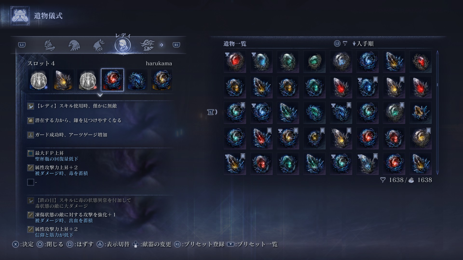 遺物効果の鎌を見つけやすくなるは必須。サイスが入手できないとダメージが出せないのでギャンブル要素のあるビルドでもあります。ハルモニア遺物2つと侵入者バフにより火力を確保しつつ、序盤の火力用に血の刃も採用。遺物難易度は高いですが、侵入者+冷気付与や血の刃・霜踏みあたりは欲しいところ。
