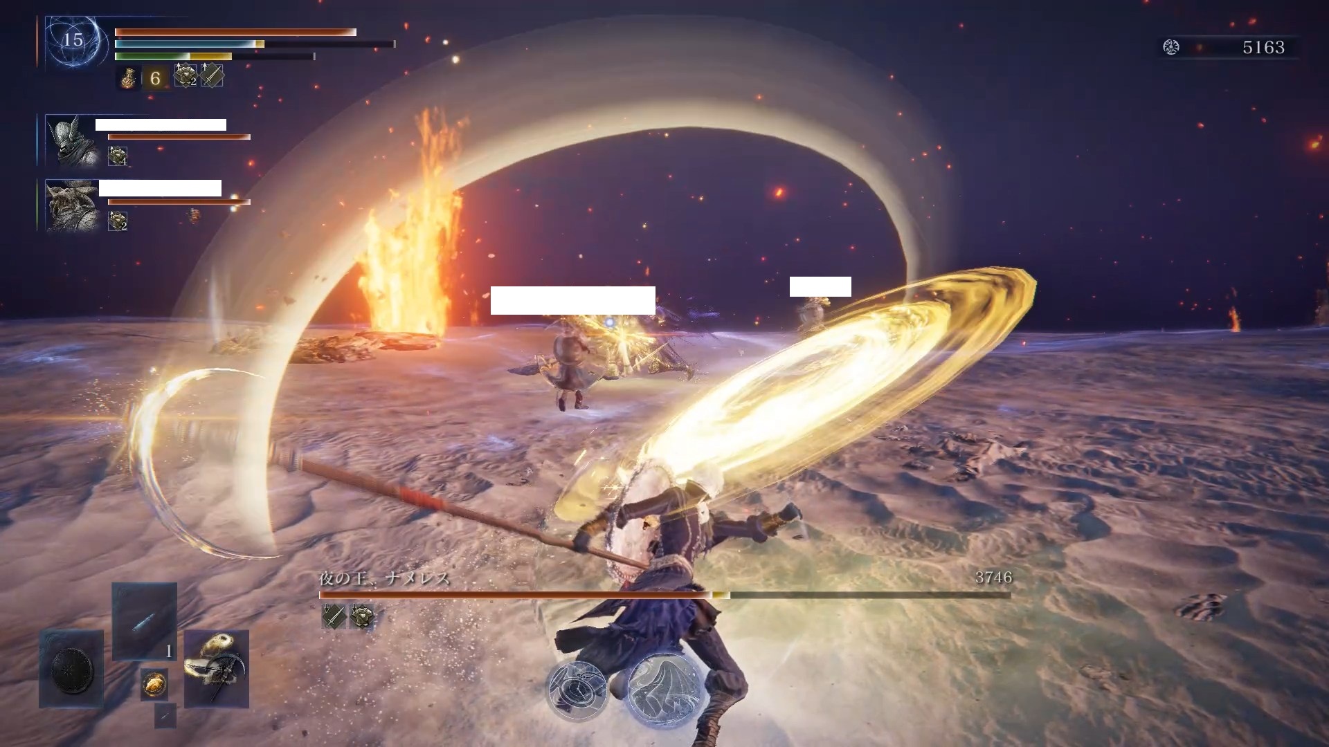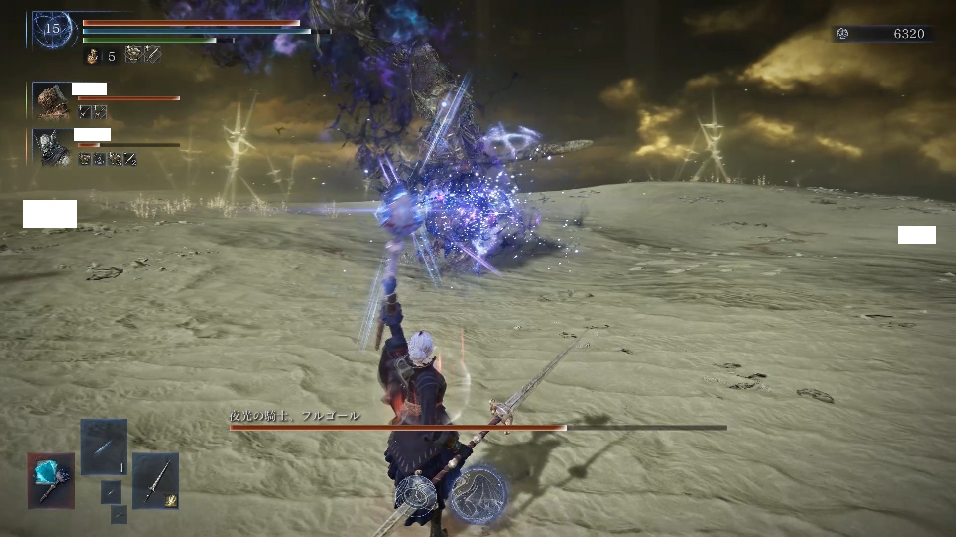 戦技型はとにかくサイスを引けないと話にならないビルドですが、サイスを引くまでの火力が低いのがネック。味方に獣爪復讐者がいるならば序盤のファームを支えてもらい、後半の火力はレディが担当するというリレーが可能。夜の王が聖弱点のボスでも、味方が守護者・無頼漢といった火力の出にくいキャラなら戦技型だとファームが事故る可能性大なので、別キャラにするか魔術型にするのがいいでしょう。とにかくこのビルドはファームをいかに上手く進められるかが課題になります。