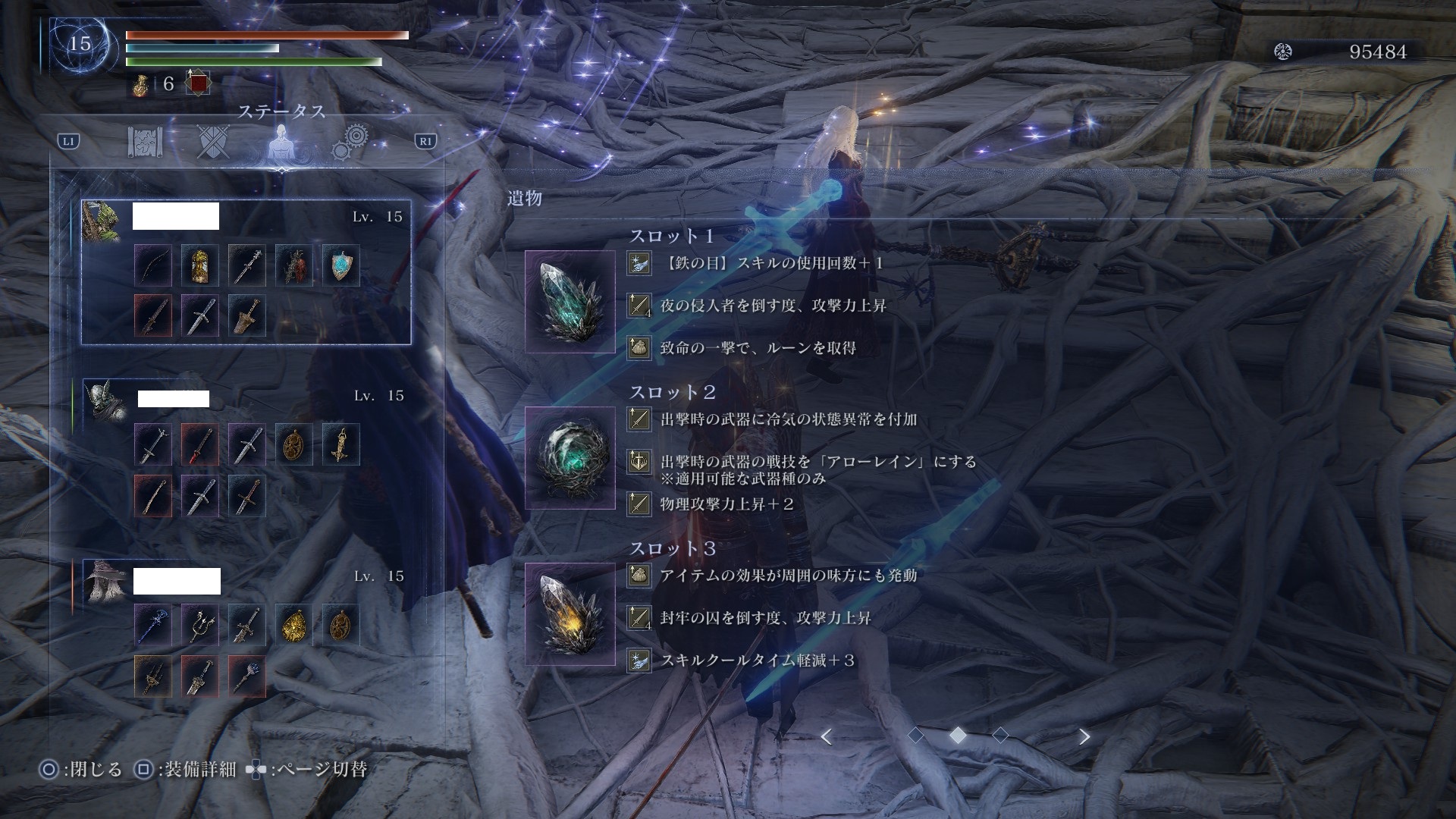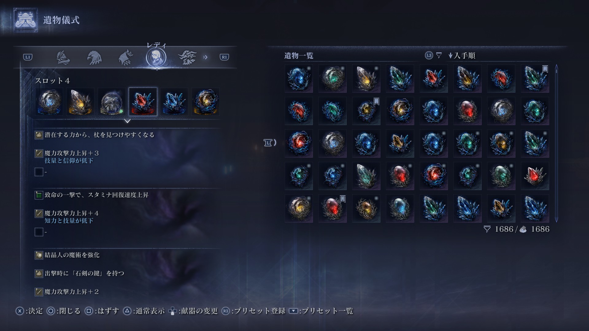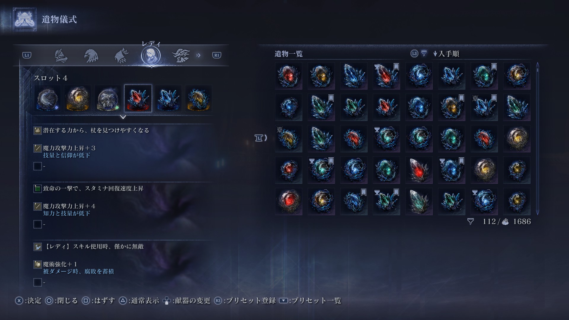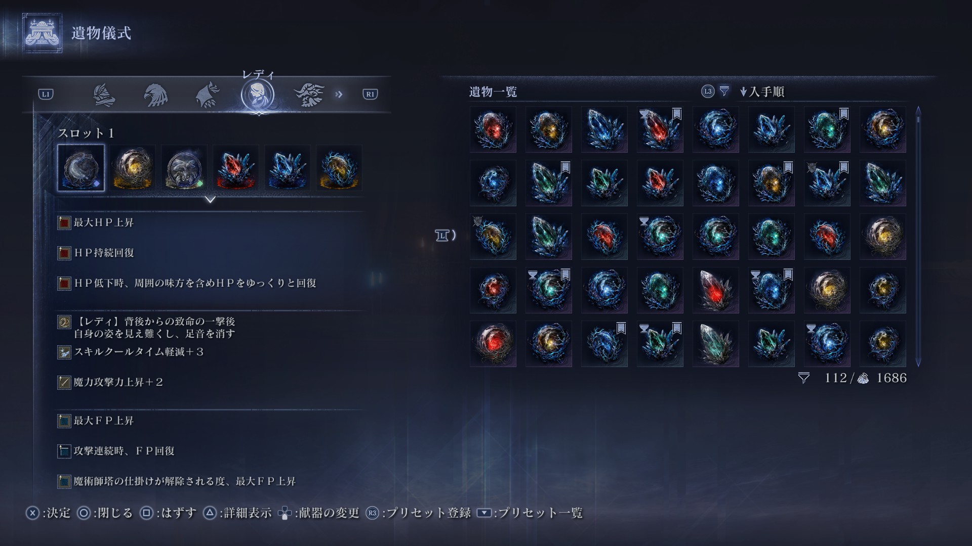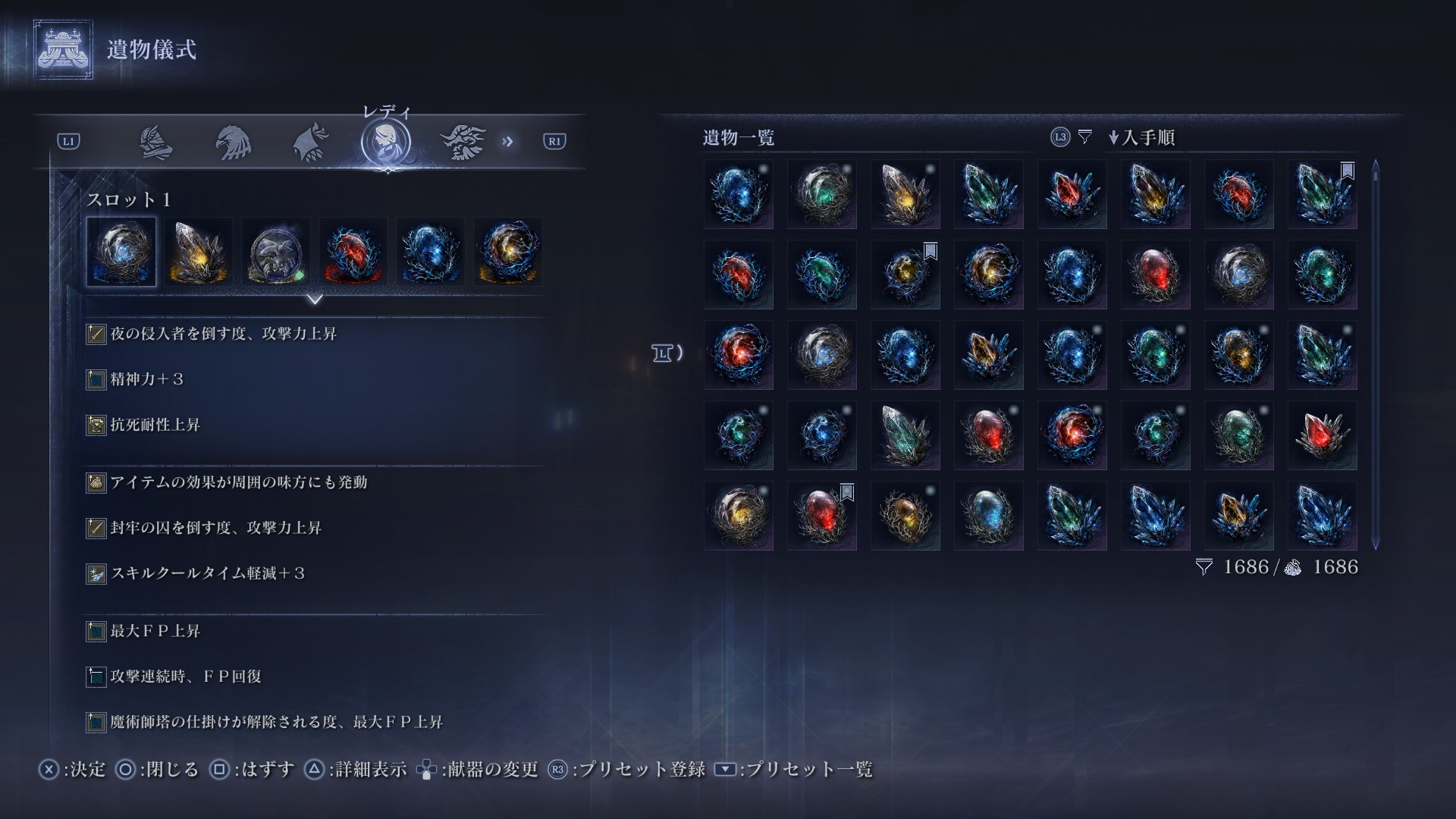 レディの遺物はフルパと野良で遺物を分けていました。と言うのも、封牢バフや侵入者バフは野良だと付けていないプレイヤーも多く、ピンを刺しても災域に行かないプレイヤーもいるので付けないようにしています。