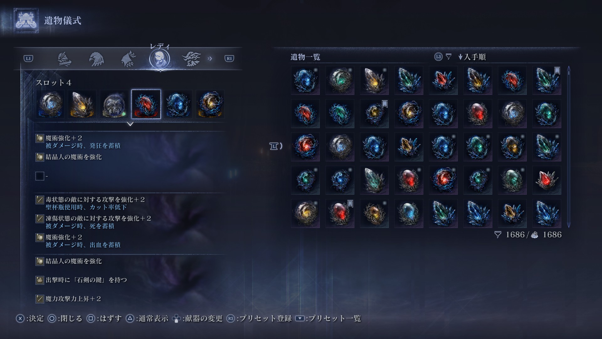 被弾時の蓄積を全て外した構成。カリゴは多段ヒットで状態異常が溜まりやすいので、火力よりも安全を最優先にしています。上の遺物構成よりは火力が落ちますが、封牢と侵入者をしっかり回れれば火力はきちんとでる構成です。