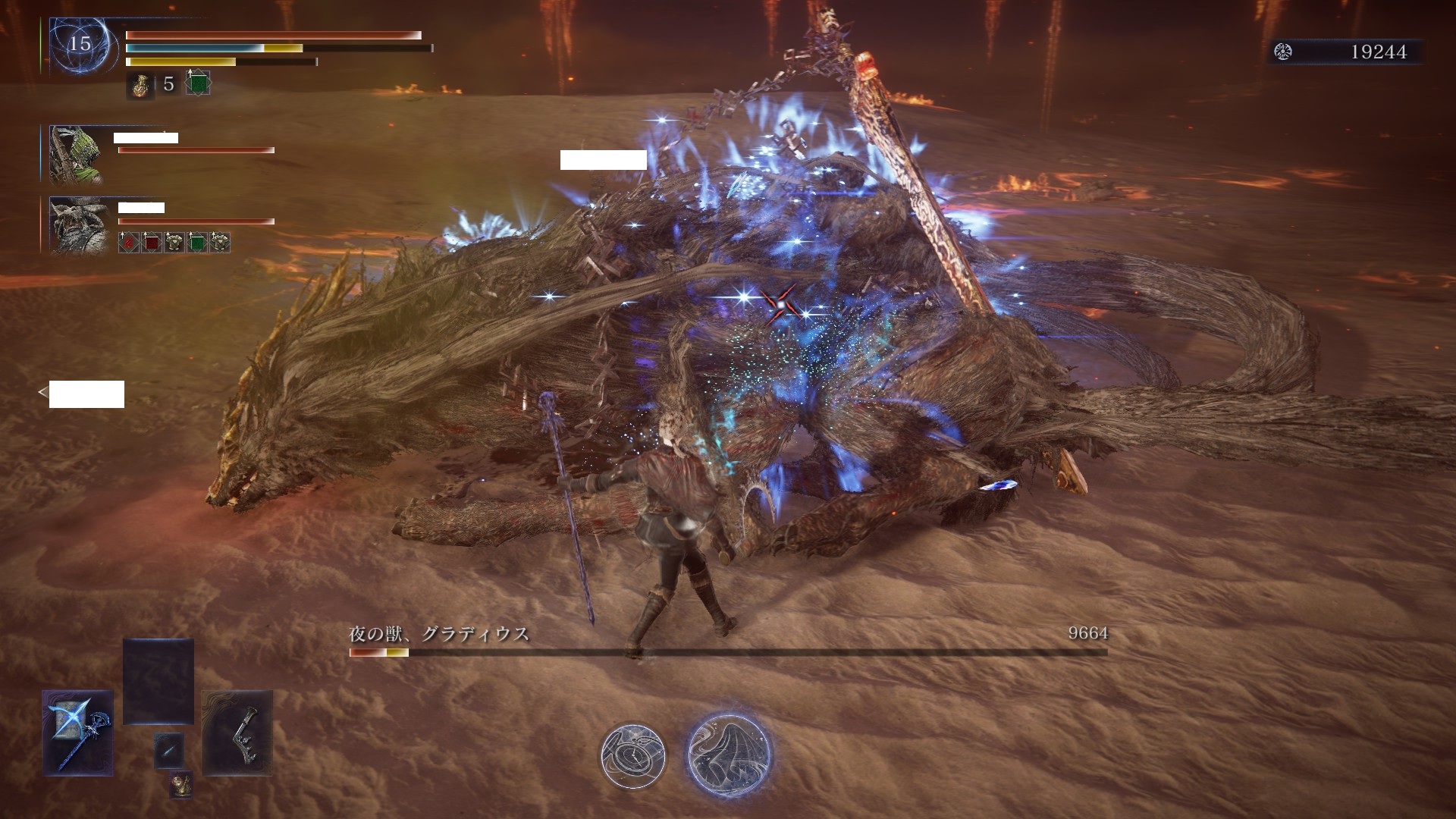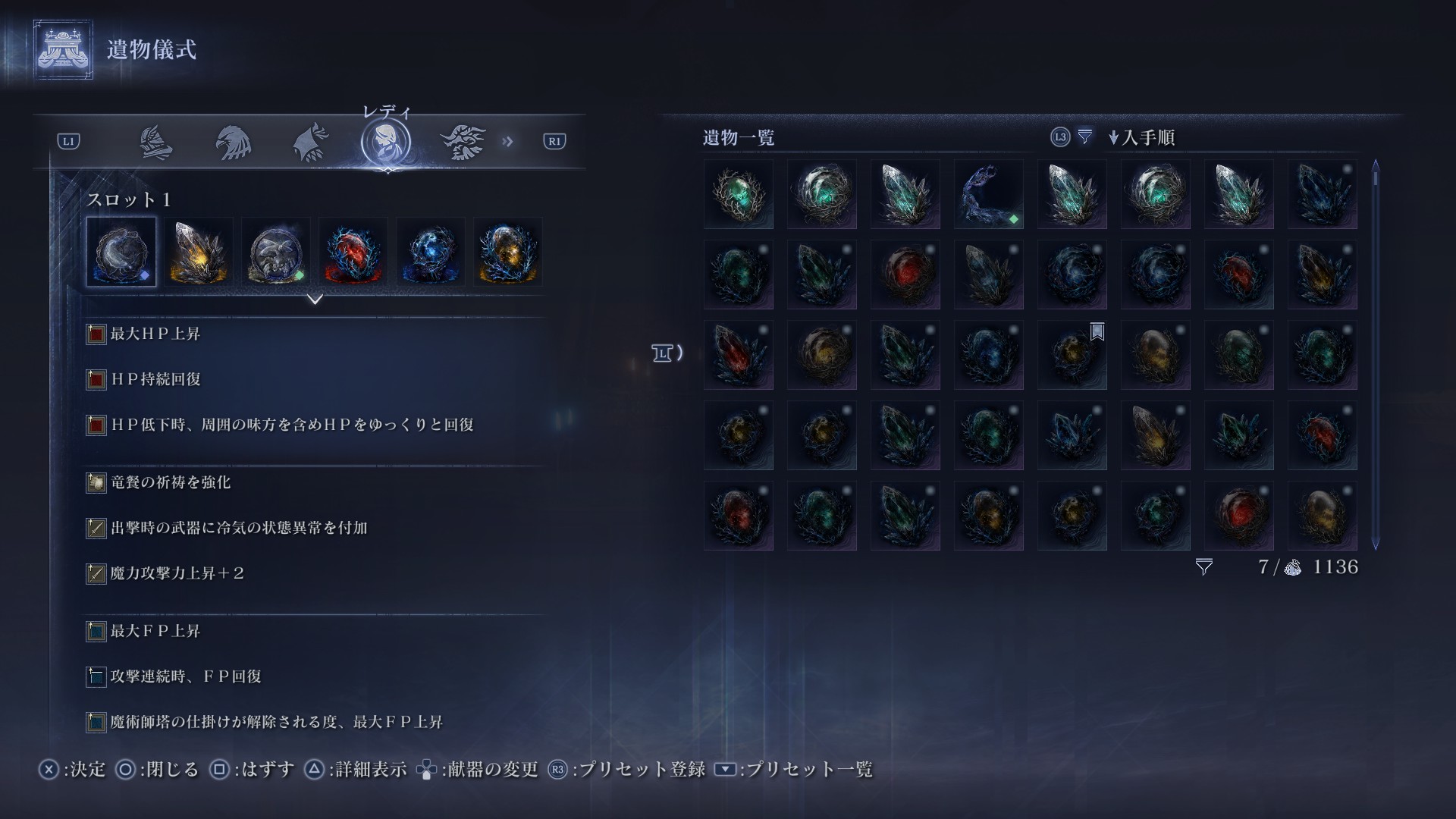 ただ最大HP時のカット率上昇と相性のいい持続マリス遺物だけは付けています。これがあると道中や夜のボス戦で長期戦になった時に役に立ちます。