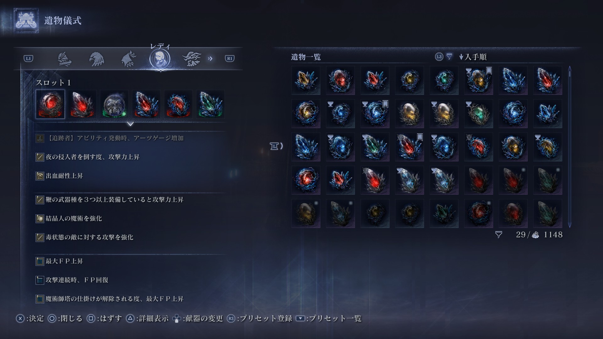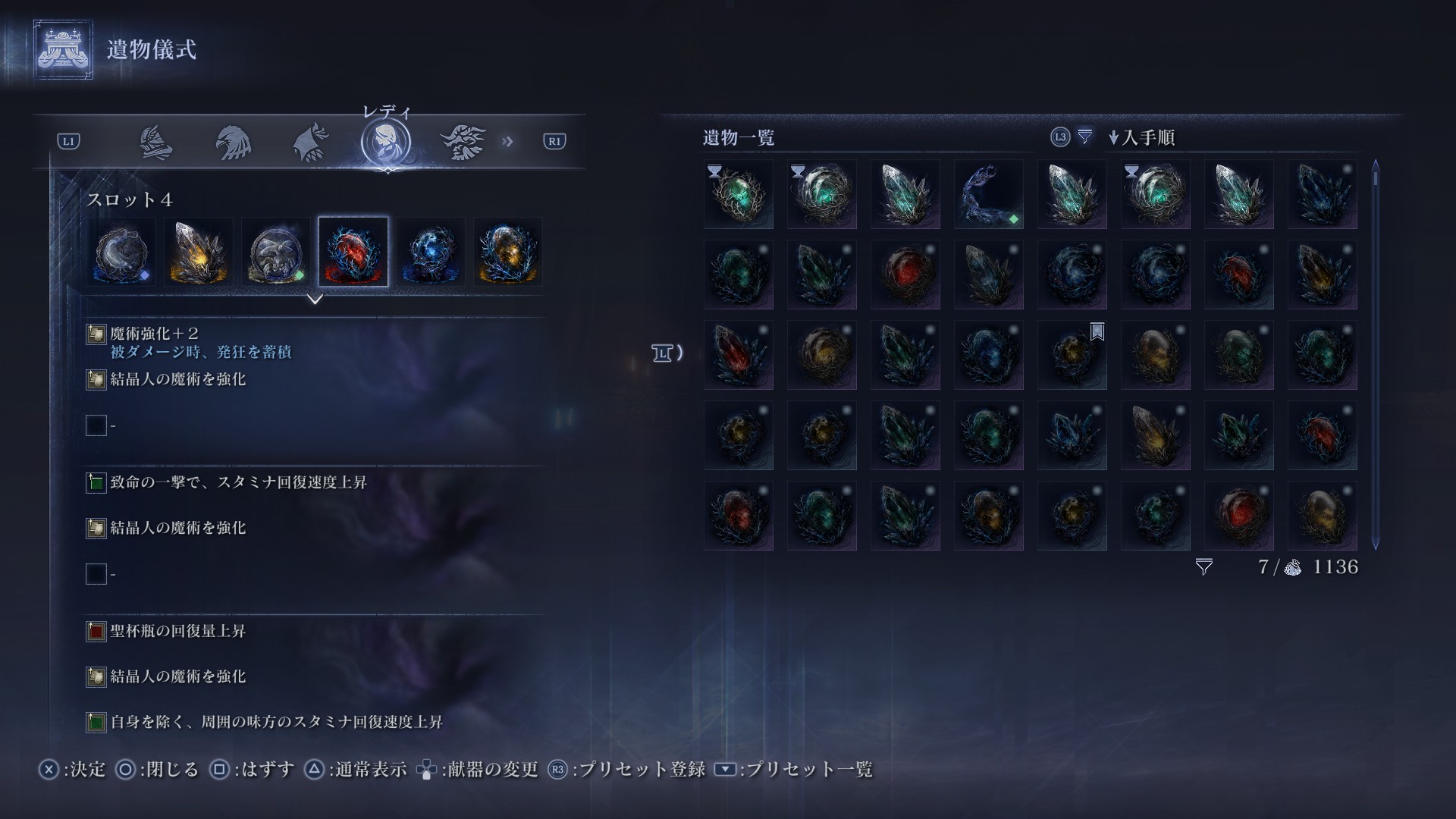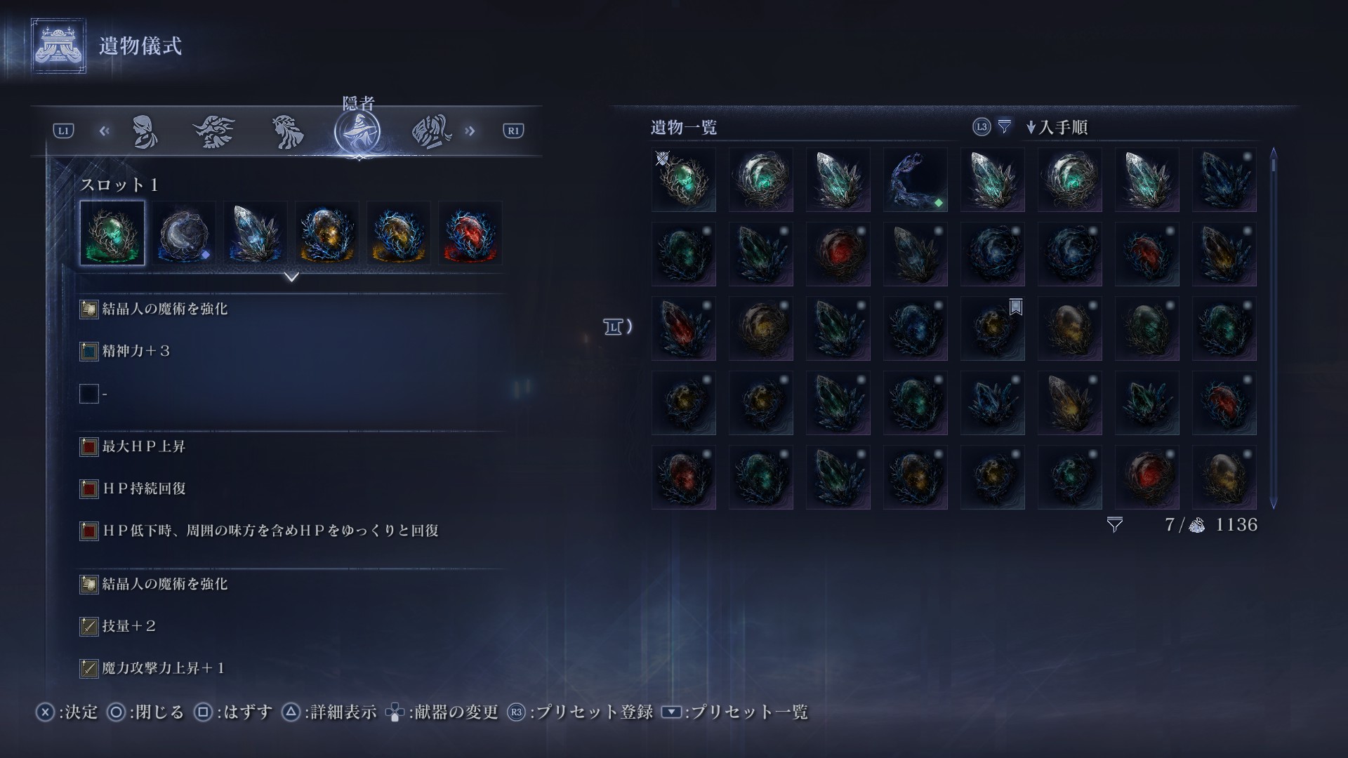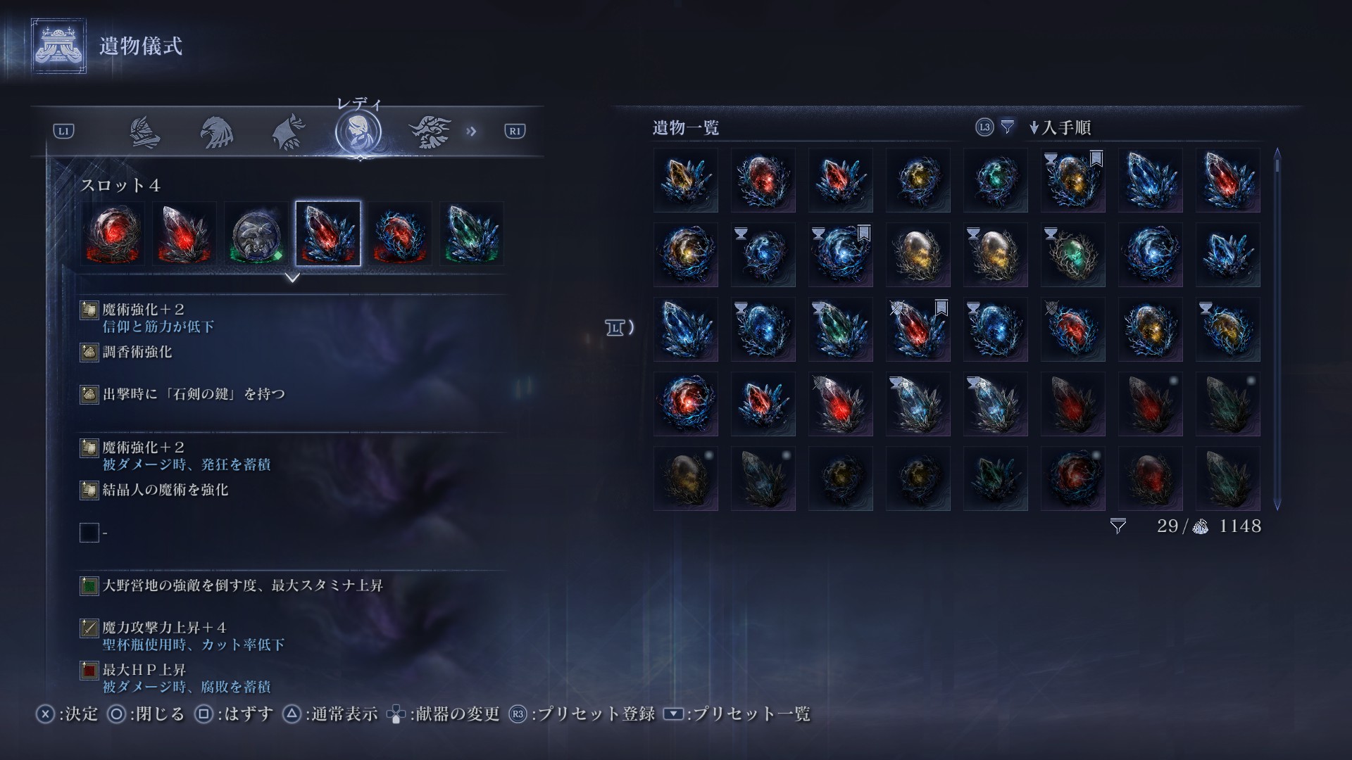 深層の遺物は結晶特化にしています。本当は魔力攻撃力+4を3積みしたいところですが、魔術強化&結晶強化の遺物がある事や、手待ち遺物のデメリット効果を考えての構成にしています。